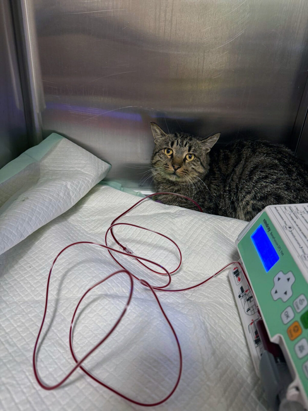 To save Smurf, an emergency blood transfusion was necessary — thrombocytopenia increases the risk of hemorrhage, and anemia means the blood has already been lost or destroyed. With a hematocrit of just 19%, Smurf’s organs were at risk of shutting down due to a lack of oxygen. Severe dehydration had also made his blood thicker and harder to circulate. Together, these complications made his condition critical and an urgent transfusion was the only chance.